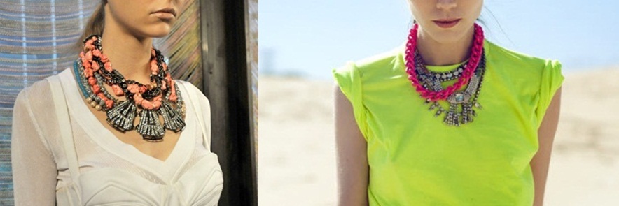 Colierele statement: colierele cu dimensiuni maxi, la baza gatului, aurii sau argintii, in culori neon, de inspiratie traditionala, cu tinte, cu aplicatii textile, cu pietre pretioase, nestemate opulente ori cristale colorate, ce imita perfect smaraldele, rubinele, safirele sau diamantele, acestea ofera tinutelor tale efectul “wow”.